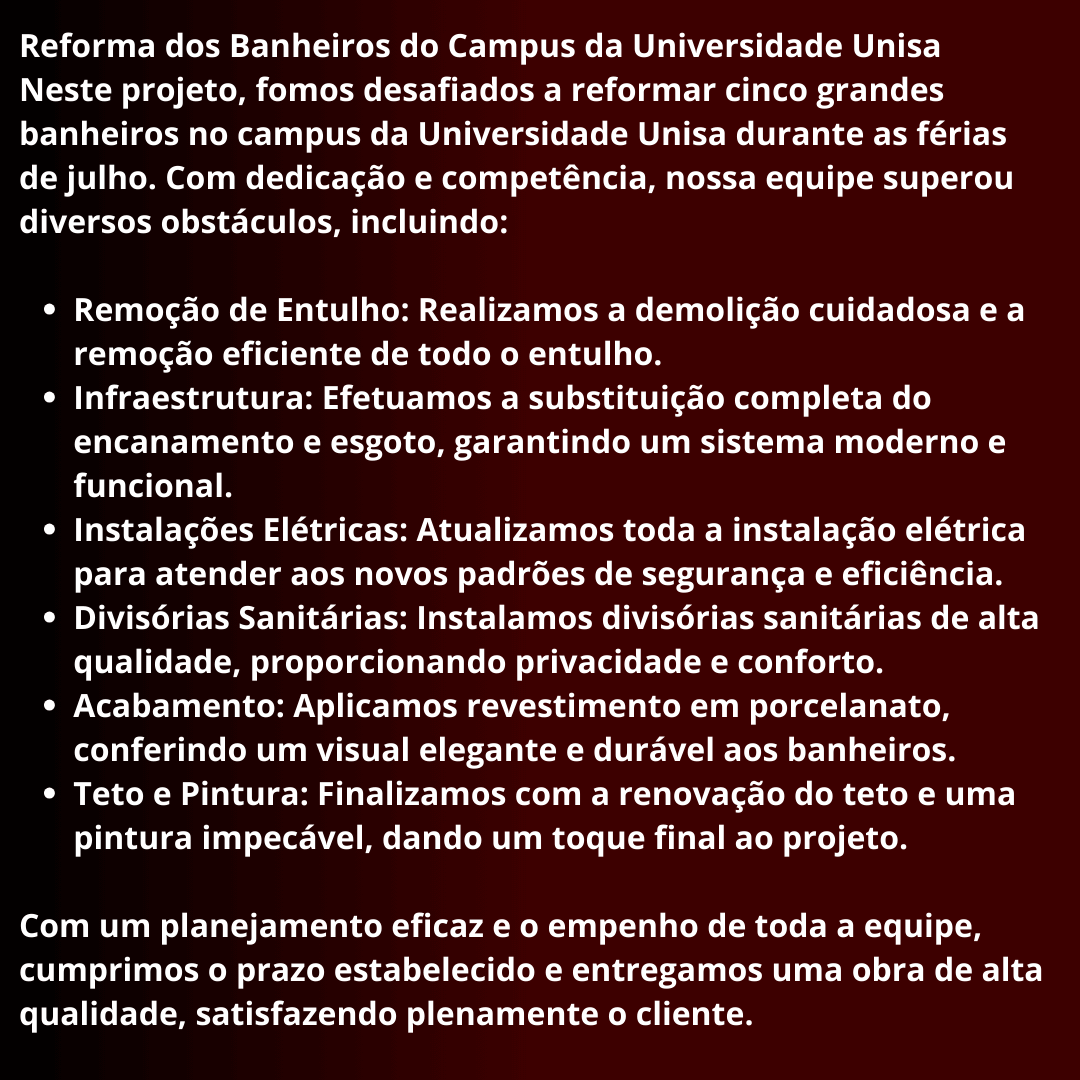 Com mais de 15 anos de experiência no setor da Construção civil, já concluímos com sucesso mais de 200 projetos, garantindo total satisfação aos nossos clientes e parceiros.
